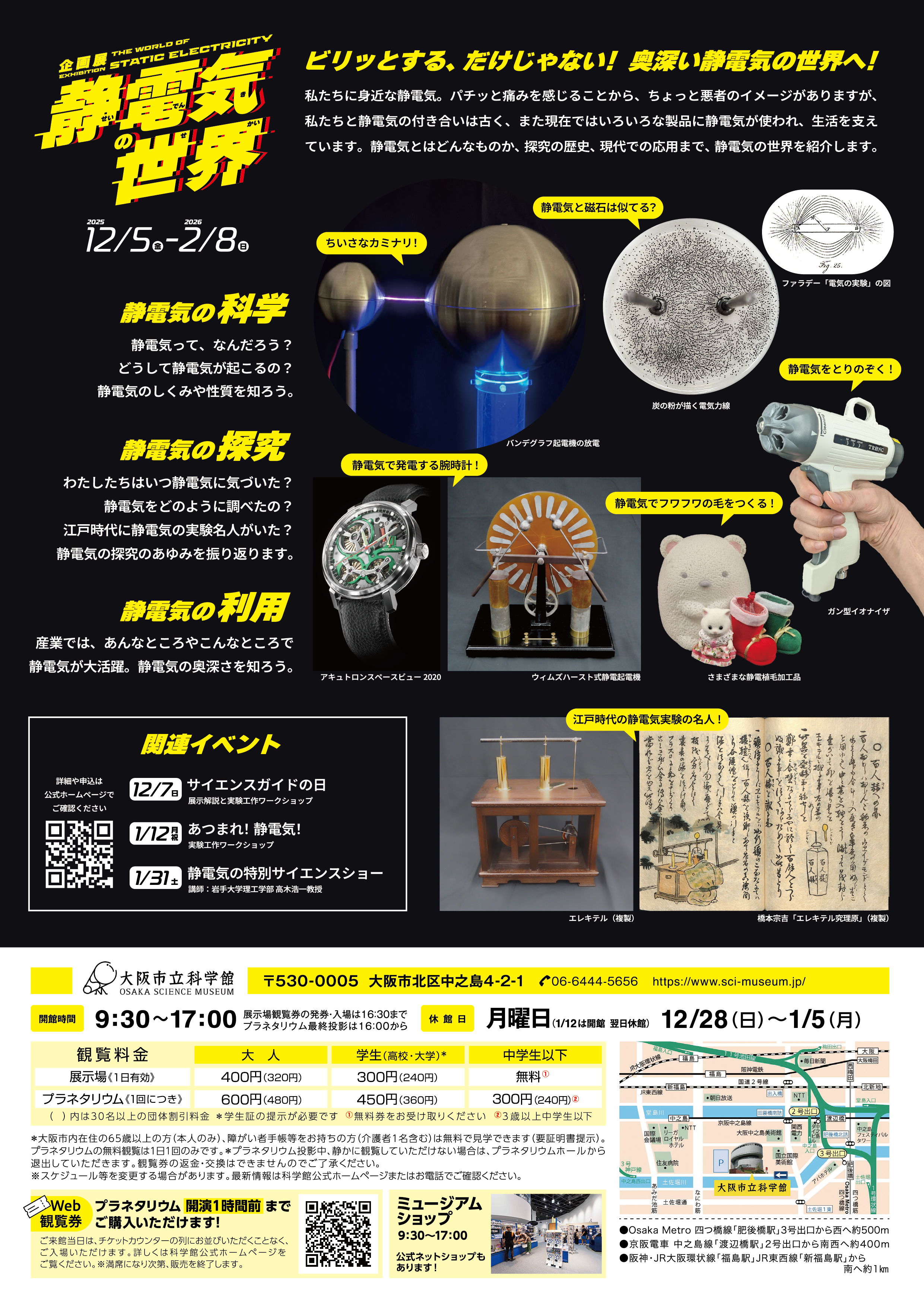 | 内容 | 科学館サイエンスガイドによる、企画展「静電気の世界」の展示解説です。 各回の所要時間は10~15分程度です。 |