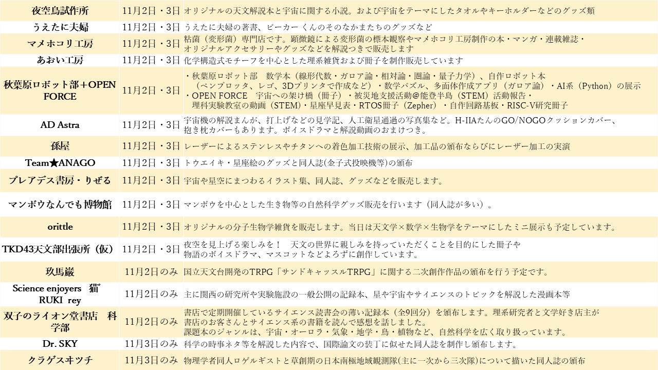 サイエンスやテクノロジーを楽しみ自作の本やグッズなどを作っている市民や、科学書籍の出版社の担当が科学の話題が好きな科学館来場者との交流するイベントです。出展者が製作した本やグッズの販売も行われます。
