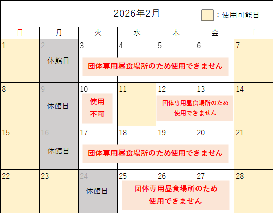イベントのない土曜日・日曜日・祝日は休憩スペースとして多目的室(1階)を開放しています。持参されたお弁当はこちらでお召し上がりください(ご利用可能な日は下記カレンダーでご確認ください)。