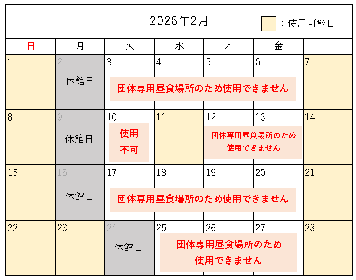 イベントのない土曜日・日曜日・祝日は休憩スペースとして多目的室(1階)を開放しています。持参されたお弁当はこちらでお召し上がりください(ご利用可能な日は下記カレンダーでご確認ください)。