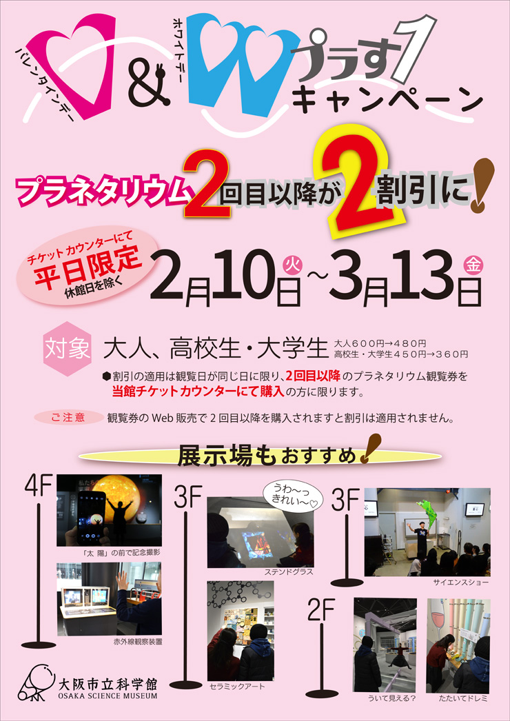 - 2/10~3/13の平日・チケットカウンタ―限定。プラネタリウム2回目以降が2割引に!